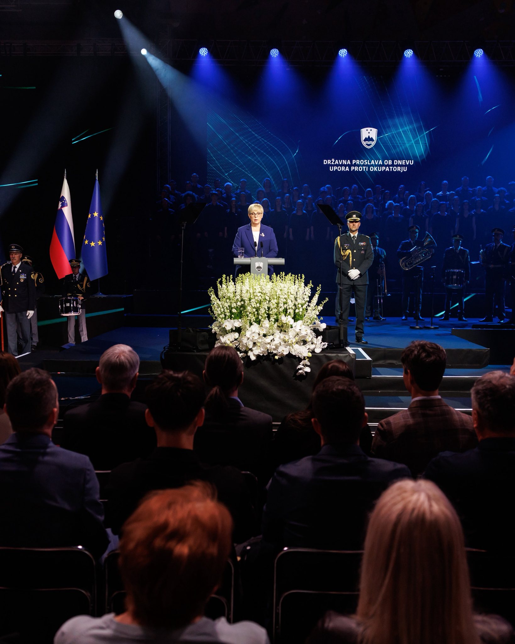 Slavnostna govornica, predsednica Republike Slovenije je na njej med drugim rekla: "Partizanstvo je bilo gibanje odpora. Bilo je gibanje poguma, solidarnosti in žrtvovanja. Žal prevečkrat ne zmoremo jasno razlikovati med odporniškim bojem in političnim sistemom, ki se je po vojni vzpostavil in je delu rojakov zadal rane, ki so še danes nezaceljene. Naj na tem mestu citiram našega mogočnega literata, velikega Borisa Pahorja: »Osvobodilni boj je bil in bo ostal mogočno drevo. Komunisti so bili kot bršljan oviti okrog njegovega debla. Bršljan pije iz debla osvobodilnega boja zase, toda drevesa ne more uničiti.« Zato danes ne slavimo ideologije. Slavimo pogum. Ne slavimo oblasti. Slavimo intimno odločitev posameznika, da se zaradi ljubezni do domovine in rojakov upre krivici. To razlikovanje ni delitev, temveč je pogoj za resnico. Resnica pa je temelj sprave".