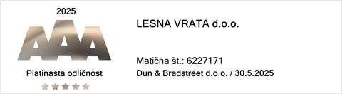 To potrjuje priznanje »Platinasta bonitetna odličnost«, ki ga prejmejo le podjetja z najvišjo bonitetno oceno Zlati AAA. Lesna vrata so ga prejela kar tri leta zapored, kar dokazuje, da jih odlikuje izjemna zanesljivost, kredibilnost in nizko tveganje za poslovne partnerje.